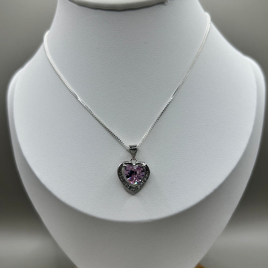 Crystal Heart Pendant on Silver Box Chain Necklace - Pink